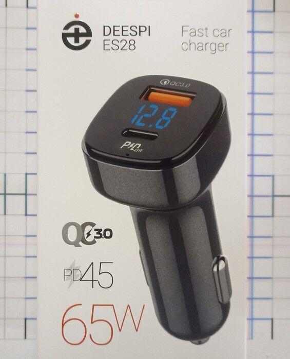 28 АЗУ USB на 2 гнезда " ES 28 DEESPI QS3.0 18W /PD 45W с ДИСПЛЕЕМ - вольтметр Usb + TypeC " ( 3.1 A держит , быстрая есть ) .